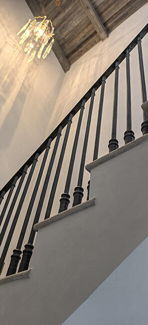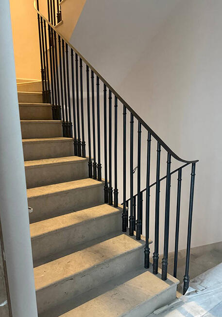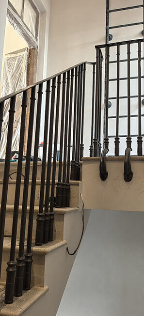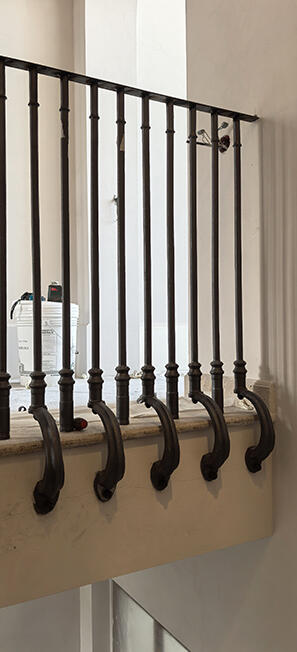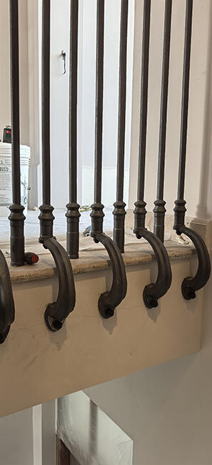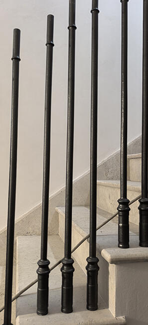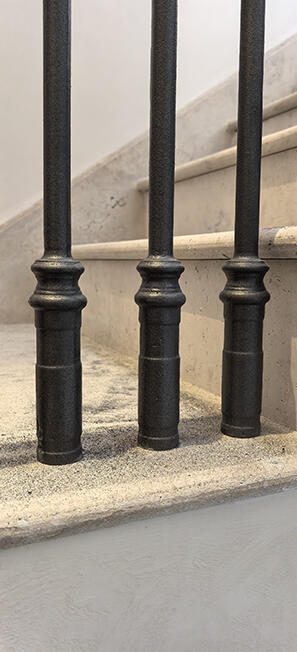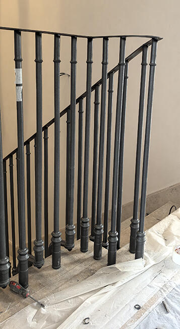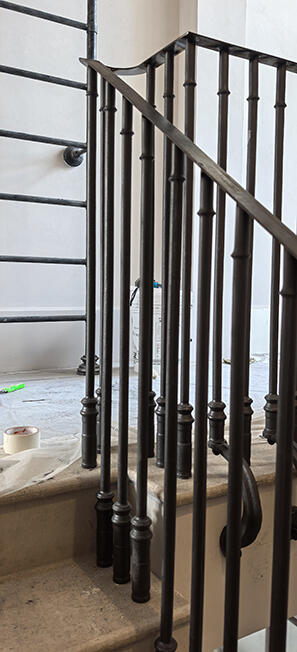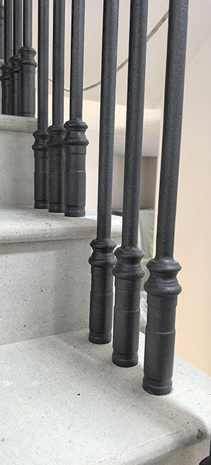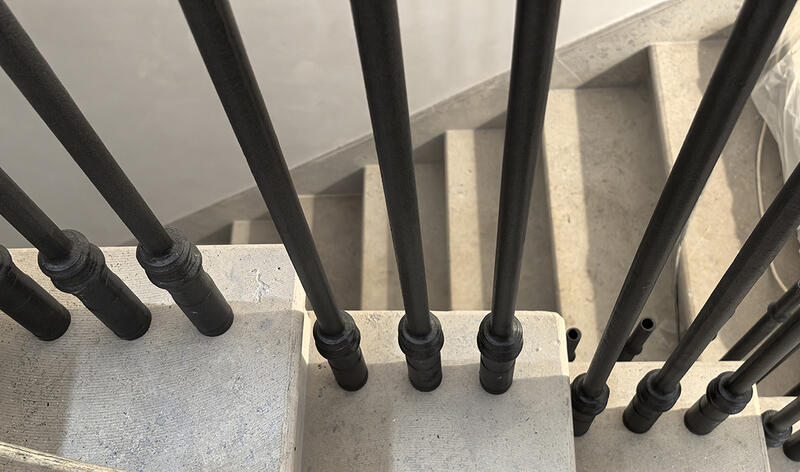 Балясины установлены по три штуки на ступень с 3D разворотами под стальную полосу с последующей установкой деревянного поручня.